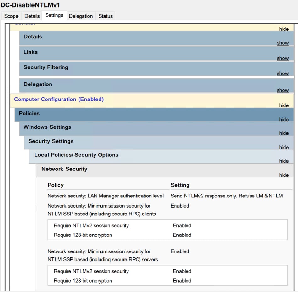 Once you have confirmed what is using NTLMv1 and dealt with any legacy dependencies, push this via your Default Domain Controllers Policy and a separate workstation GPO: