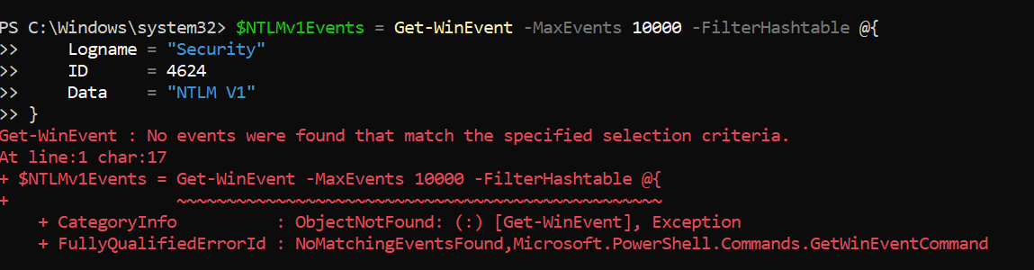 Get-WinEvent -FilterHashtable @{ LogName='Security'; Id=4624 } | Where-Object { $_.Message -match 'NTLM V1' } | Select-Object TimeCreated, Message ```No results means NTLMv1 is not showing up in auth logs. Keep monitoring for another two weeks to catch anything that only authenticates on a schedule like scheduled tasks or backup jobs.